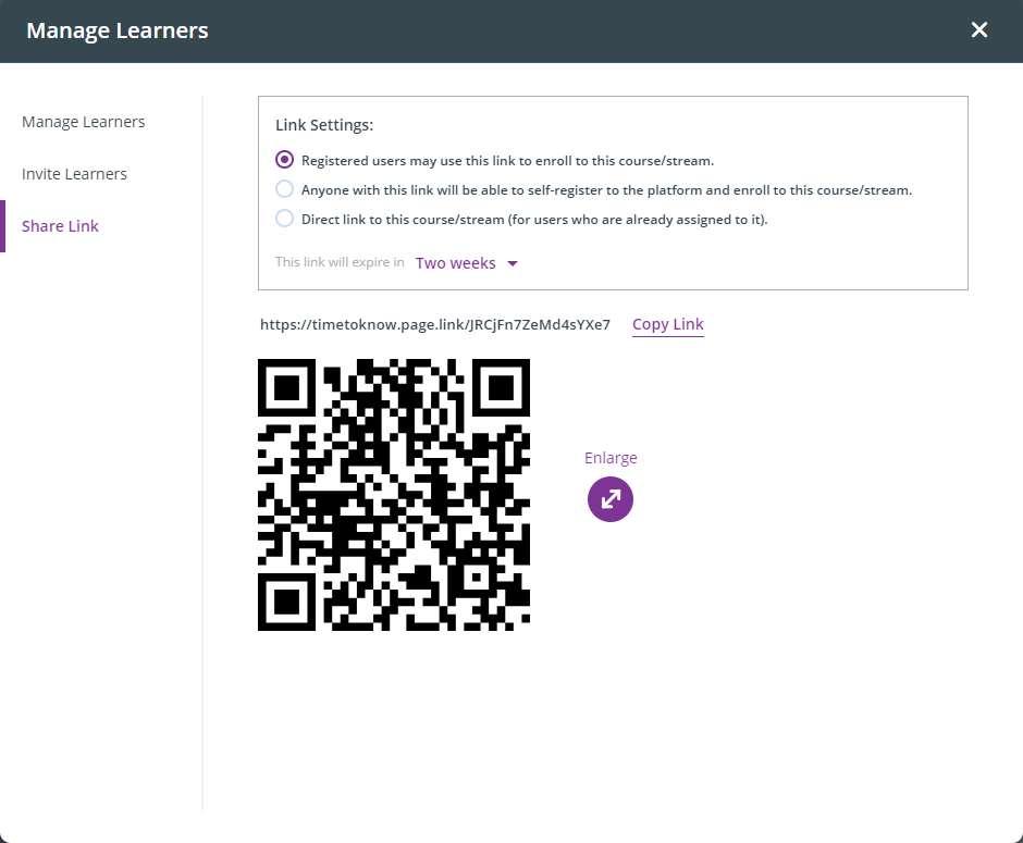 NOTE: Every time you enter the Manage Learners menu, the platform generates a new invitation link and QR code that you can send directly to your learners.