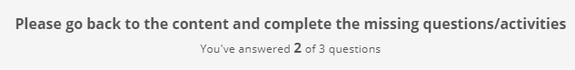 Use the Must Complete to proceed switch on the content Item settings page. When enabled, users must answer all questions on a page before proceeding to the next page. Users must answer any embedded question when applied to interactive videos to keep watching the video.