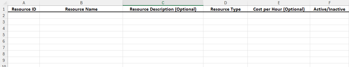 Para actualizar uno o más recursos existentes, simplemente modifique sus atributos relevantes y cargue el archivo de Excel actualizado. Asegúrese de mantener el mismo ID de recurso, que es su identificador único para realizar cambios en ese recurso; así es como el sistema entiende qué recurso desea modificar.