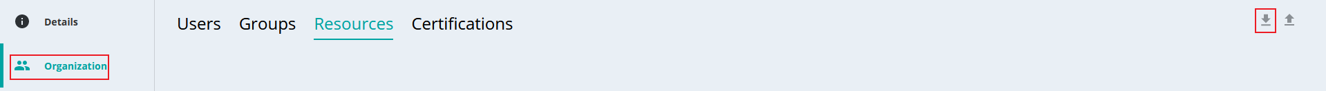 En la interfaz de administración, seleccione Organización en el menú lateral de la izquierda y haga clic en la pestaña Recursos . Haz clic en el icono de la flecha hacia abajo ⬇ para descargar un archivo de Excel vacío: