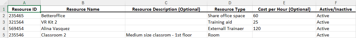 Si su cuenta ya tiene recursos de capacitación que se cargaron anteriormente, aparecerán en el archivo de Excel descargado. Esto es normal y le permite actualizar cualquier atributo de estos recursos (incluso cambiar su estado de activo a inactivo).