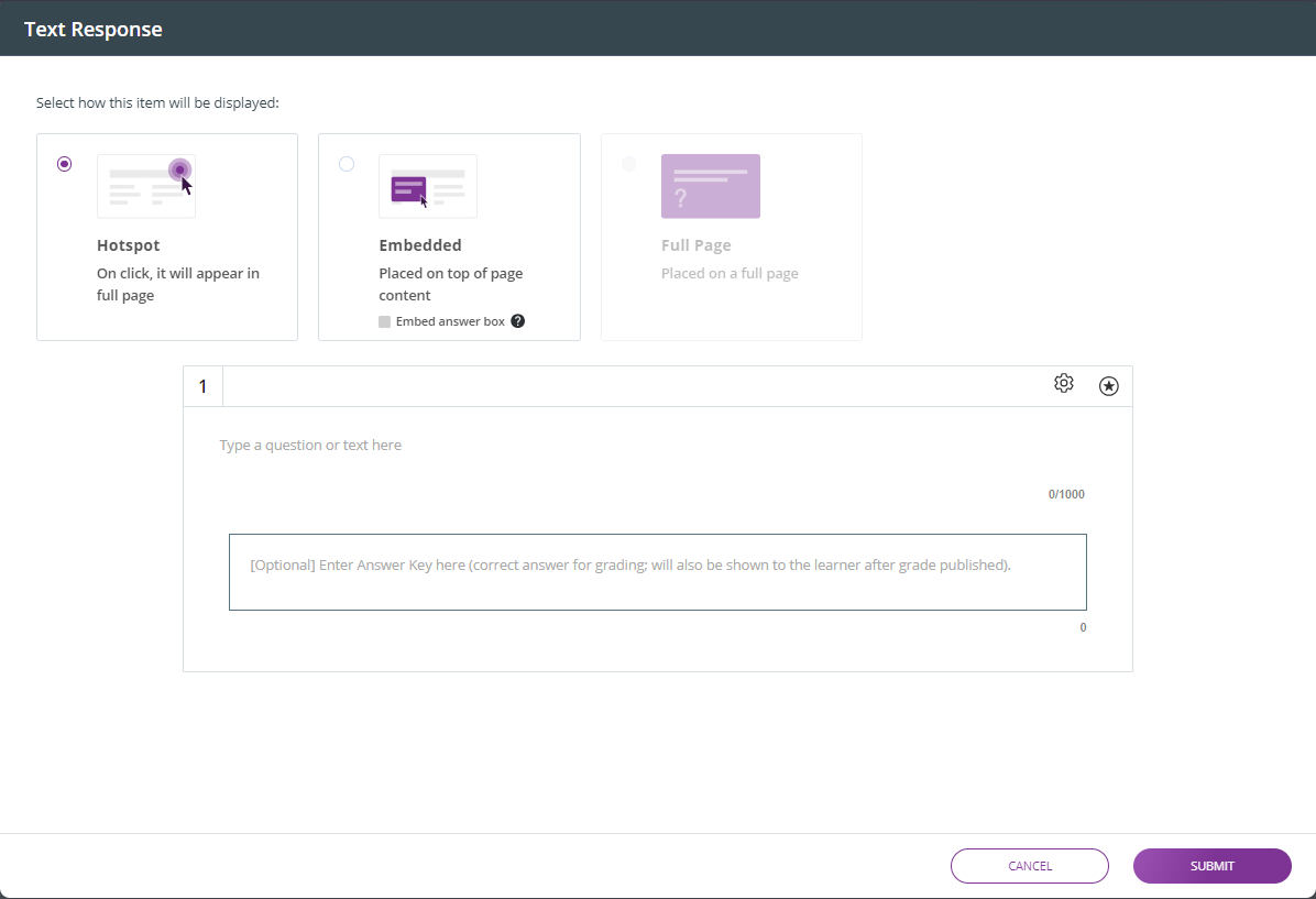 Al crear preguntas abiertas (respuesta de texto), puede agregar una "clave de respuestas" para que el instructor la use como referencia al calificar manualmente la respuesta del alumno. Además, esta clave de respuestas se presentará a los alumnos en el informe solo después de que el instructor califique sus respuestas.