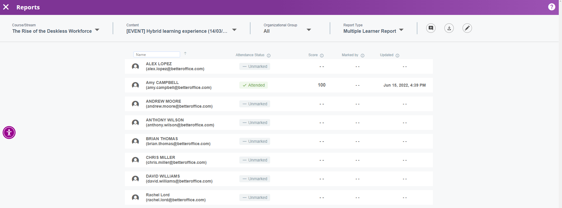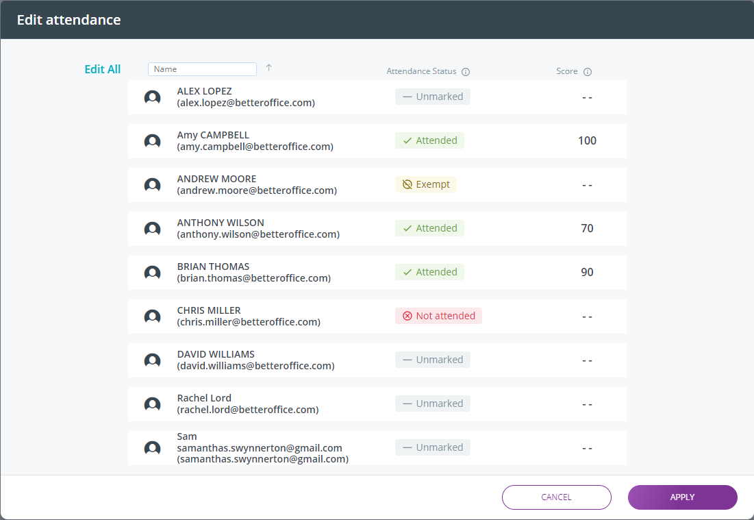 O Relatório de Presença exibe uma lista de todos os alunos atribuídos junto com seu status de frequência (Participou/Não atendido/Isento) e pontuação (se o evento tiver sido definido como um evento com pontuação).