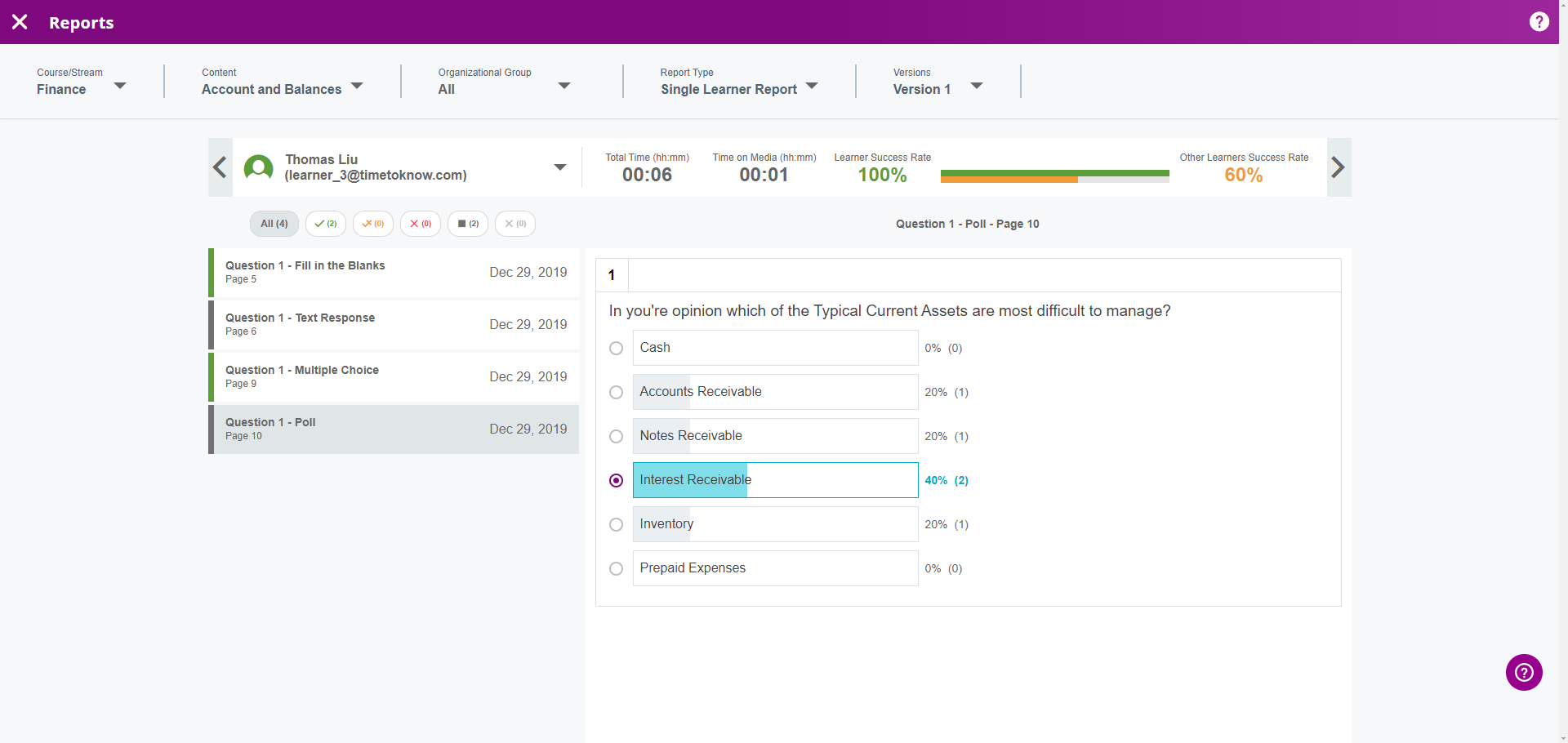 Single Learner Report mostra o desempenho de um único aluno para cada item de conteúdo. Clique em uma pergunta específica para ver a resposta preenchida pelo aluno.