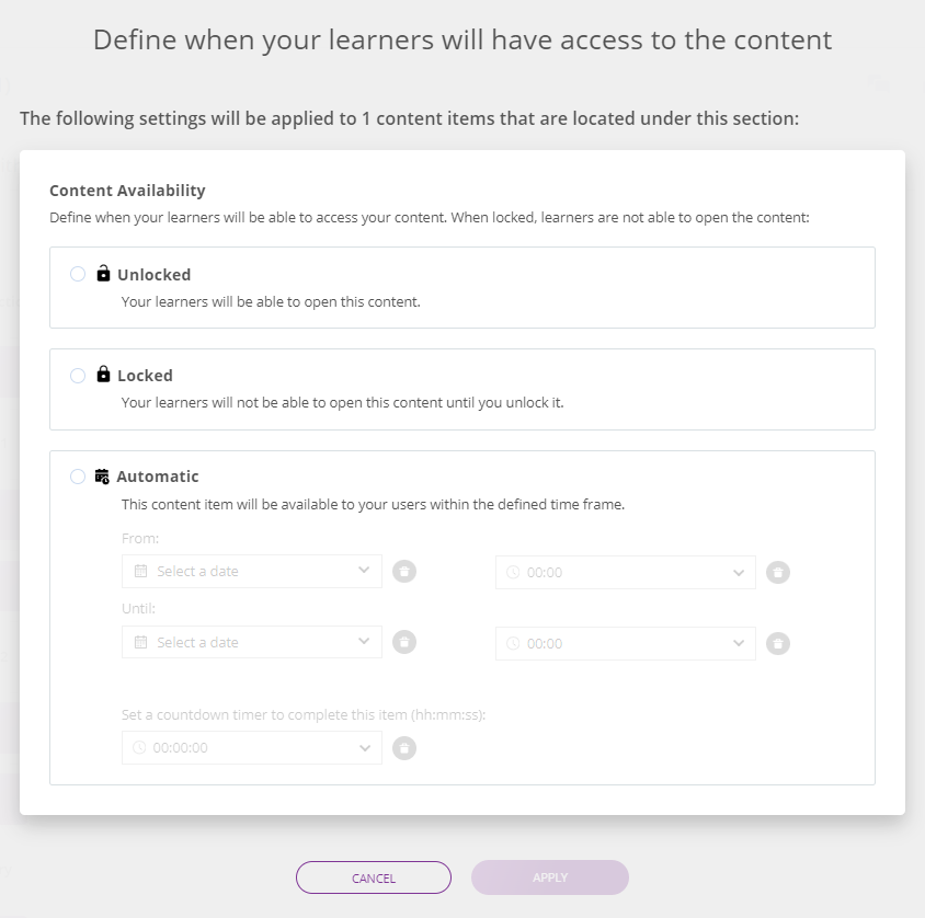 Agora defina a configuração de Disponibilidade de conteúdo que gostaria de aplicar a todos os itens de conteúdo atualmente nesta seção e clique em Aplicar.